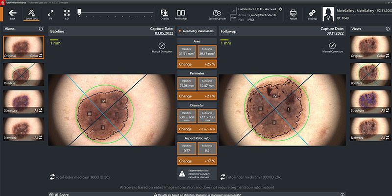Even though the classic examination with a reflected light microscope is very thorough, it only provides a snapshot. Changes cannot therefore be detected. Videoscopy (digital microscopic individual images) provides us with this information, but only for moles that are already under observation. ATBM also detects new or previously inconspicuous pigment changes. Combining these methods achieves the greatest possible certainty for the early detection of skin cancer. This is our area of expertise.